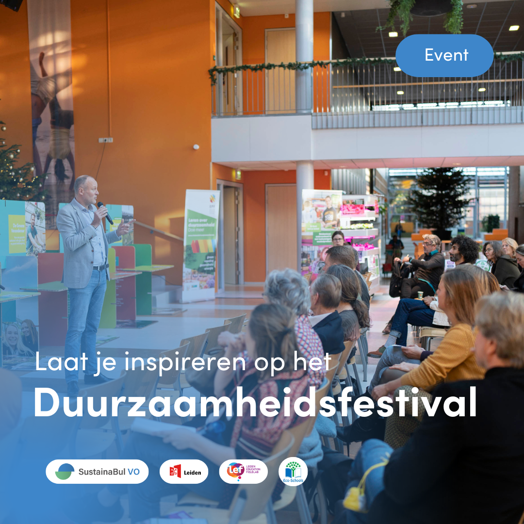 ![]() De Nationale Onderwijsweek van Leiden Nationale Onderwijsstad wordt spetterend en duurzaam afgesloten met het landelijk Duurzaamheidsfestival voor het Onderwijs op 10 oktober 10.30 - 17.00 bij het LEF. Georganiseerd door: Leren voor Morgen, Eco Schools, Gemeente Leiden, het LEF, het Duurzaam Docenten Netwerk Leiden en de Klimaatklas |