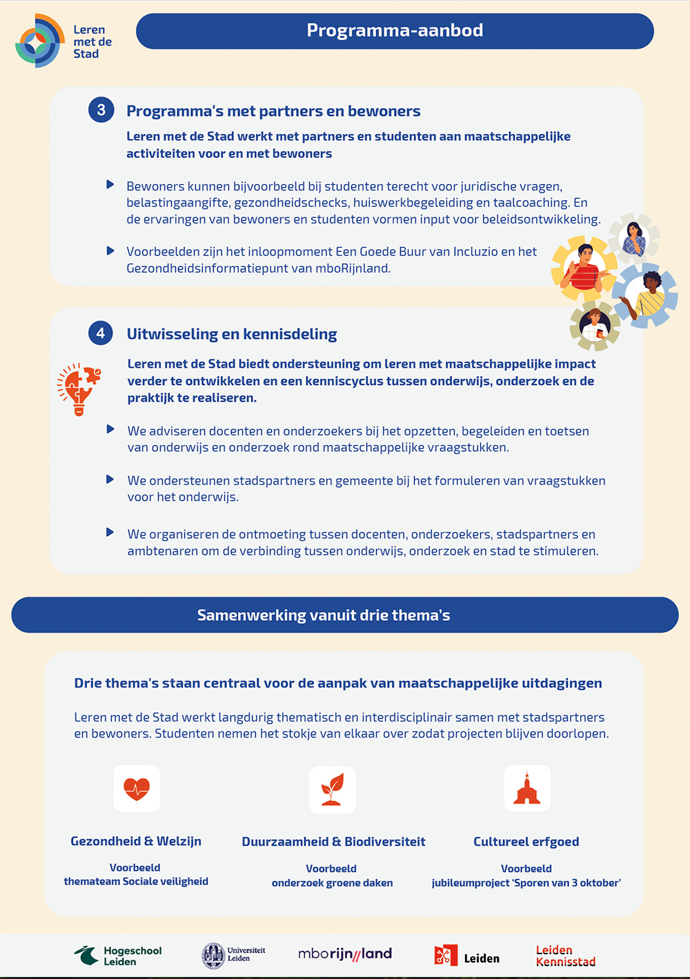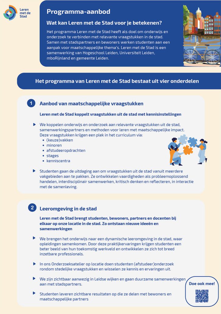 Leren met de Stad verbindt studenten, docenten, onderzoekers, bewoners en maatschappelijke partners rondom actuele vraagstukken in Leiden. We koppelen onderwijs en onderzoek aan thema’s als duurzaamheid, gezondheid, veiligheid, welzijn en cultureel erfgoed.