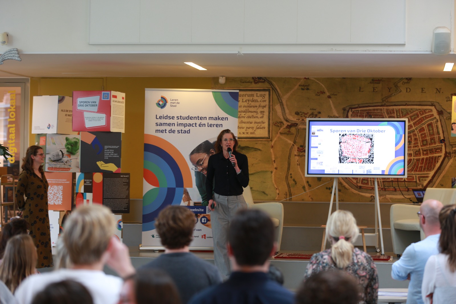 Dit jaar werken mbo-studenten samen met wo’ers en hbo’ers aan ‘Sporen van 3 oktober’, ter ere van het 450-jarig jubileum van het Leidens Ontzet. Tijdens de gezamenlijke sessie op het podium vertelde een docent van het mboRijnland over het project: “We hebben ons gericht op de vraag: hoe betrek je jongeren bij het Leidens Ontzet? Veel jongeren associëren 3 oktober vooral met feest, kermis en een vrije dag. Hoe kunnen we hen bekendmaken met het verhaal achter deze dag? Ons idee: een epische quest door Leiden met acht stops waar je het hele verhaal van het Leidens Ontzet leert kennen. Dit doen we op een ludieke manier, bijvoorbeeld door in de audiotour een verslaggever uit 1574 te laten horen. We hebben ook een podcast genaamd Belegbabbels en twee juice queens uit 1574 die het nieuws bespreken. Daarnaast hebben hogeschoolstudenten Commerciële Economie initiatieven ontwikkeld voor middelbare scholen en basisscholen, zoals met de klas de route gaan lopen en een bijbehorende quiz met kans op een beloning.”