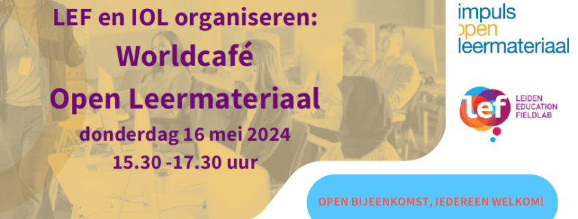 In samenwerking met Impuls Open Leermateriaal (IOL) organiseert het LEF een World Café over Open Leermateriaal voor alle (Leidse) onderwijsprofessionals die hierover meer willen weten. Open leermateriaal is al het educatief materiaal dat vrij en publiek beschikbaar wordt gesteld. Je kunt het zelf aanpassen, combineren, hergebruiken, bewaren en delen.