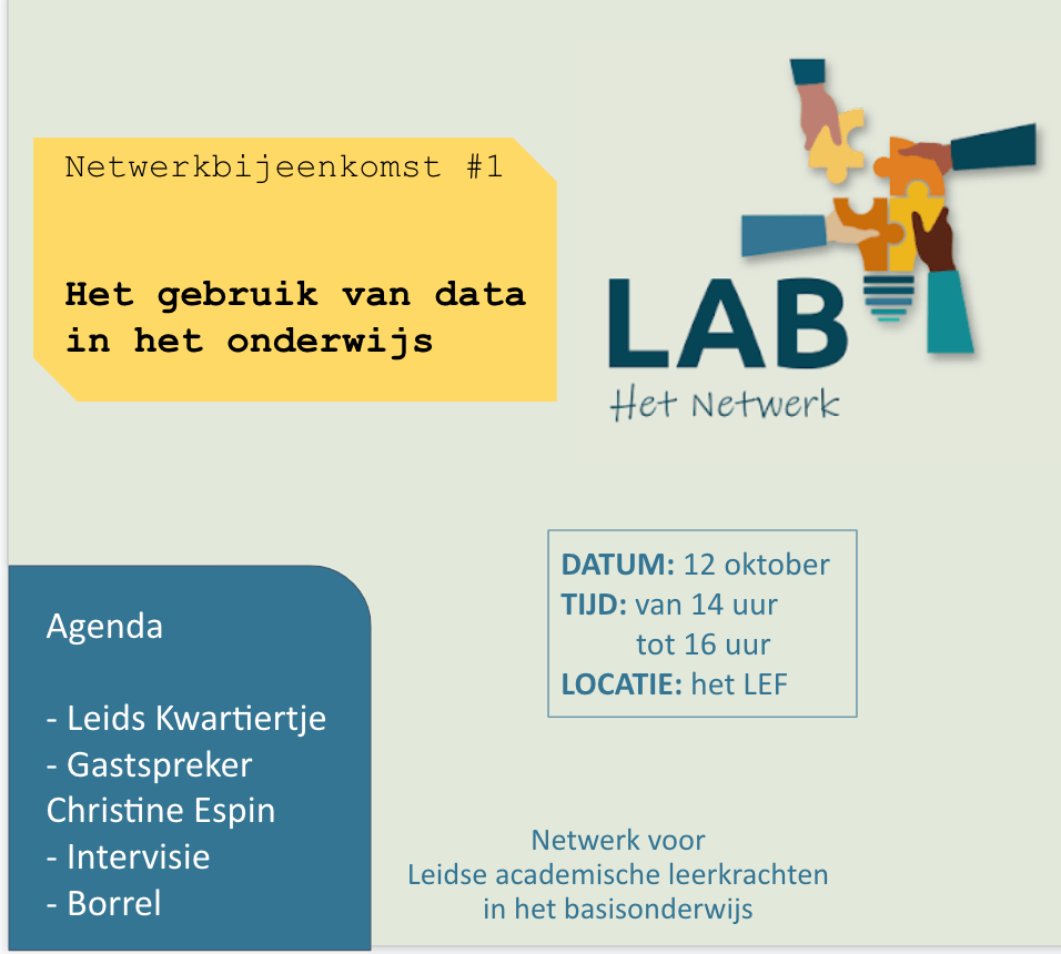 Het LEF Betaplein 18, Leiden, Zuid-Holland, Nederland12 oktober: eerste netwerkbijeenkomst van het LAB-Netwerk! Op woensdagmiddag 12 oktober is het zo ver: de eerste bijeenkomst voor Leidse Academici in het Basisonderwijs. Op het programma staat een presentatie van Christine Espin, hoogleraar aan de Universiteit Leiden. Zij zal het publiek meenemen in het gebruik van data in het onderwijs. We zullen hierover ook […]