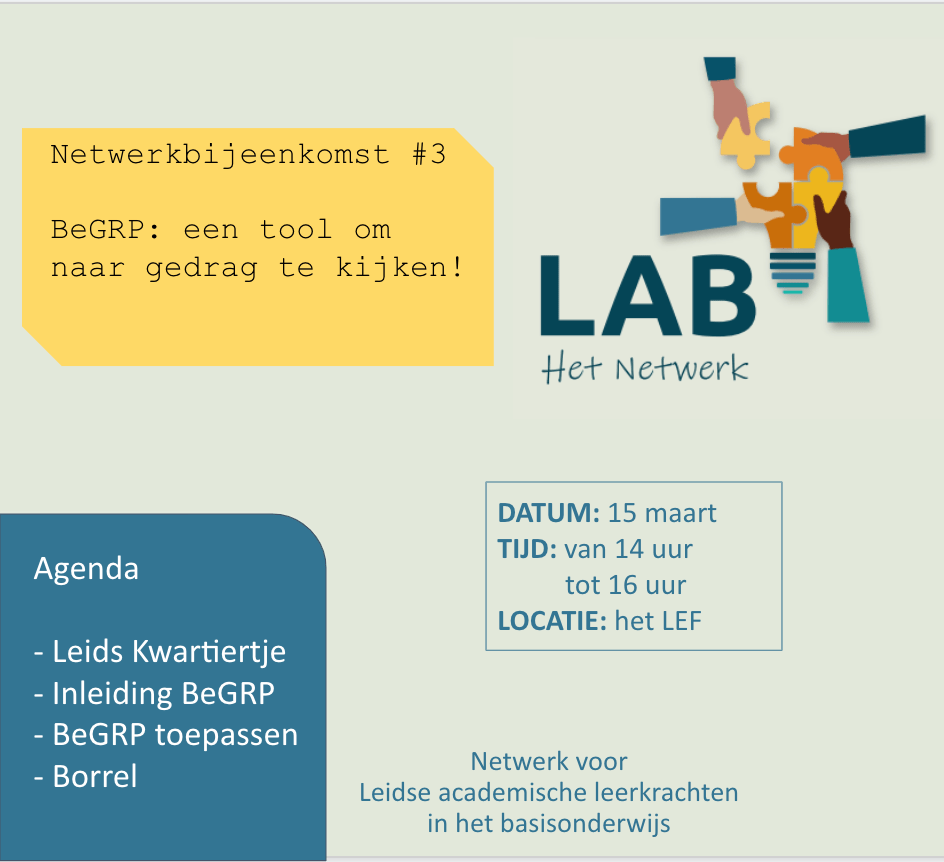 Het LEF Betaplein 18, Leiden, Zuid-Holland, NederlandLAB- het netwerk #3 Het derde LAB-netwerk (hét netwerk voor academische leerkrachten in Leiden) zal op woensdag 15 maart 2023 plaatsvinden. De bijeenkomst start om 14:00 uur met een Leids kwartiertje. Daarna wordt de verdieping gezocht in "BeGRIP": een tool in ontwikkeling om grip te krijgen op het gedrag van leerlingen. Door middel van een […]