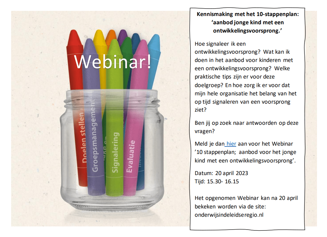 OnlineOp donderdag 20 april wordt vanuit het project 'begaafde leerling' van de Leidse Aanpak/ Het LEF een Webinar gegeven over het 10-stappenplan: aanbod jonge kind met een ontwikkelingsvoorsprong. Tijdens het Webinar leer je hoe je het 10-stappenplan kan gebruiken. In twee break-out rooms zal uit elkaar gegaan worden om dieper op de stappen Aanbod en […]