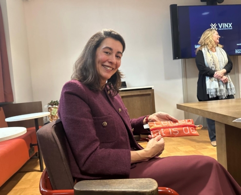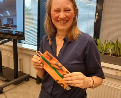 Alle Leiden Nationale Onderwijsstad vlaggen zijn door een Leidse sociale werkplaats verwerkt in etuitjes. Het LEF reikt etuitjes uit aan die mensen in Leiden die in 2026 een vervolg geven in hun werk om er samen dwars doorheen te blijven gaan. Dus niet terugkijkend naar wat er gebeurd is, maar vooruitkijken naar wat er komt. Deze keer gaat het etuitje naar Fabienne van der Meer.